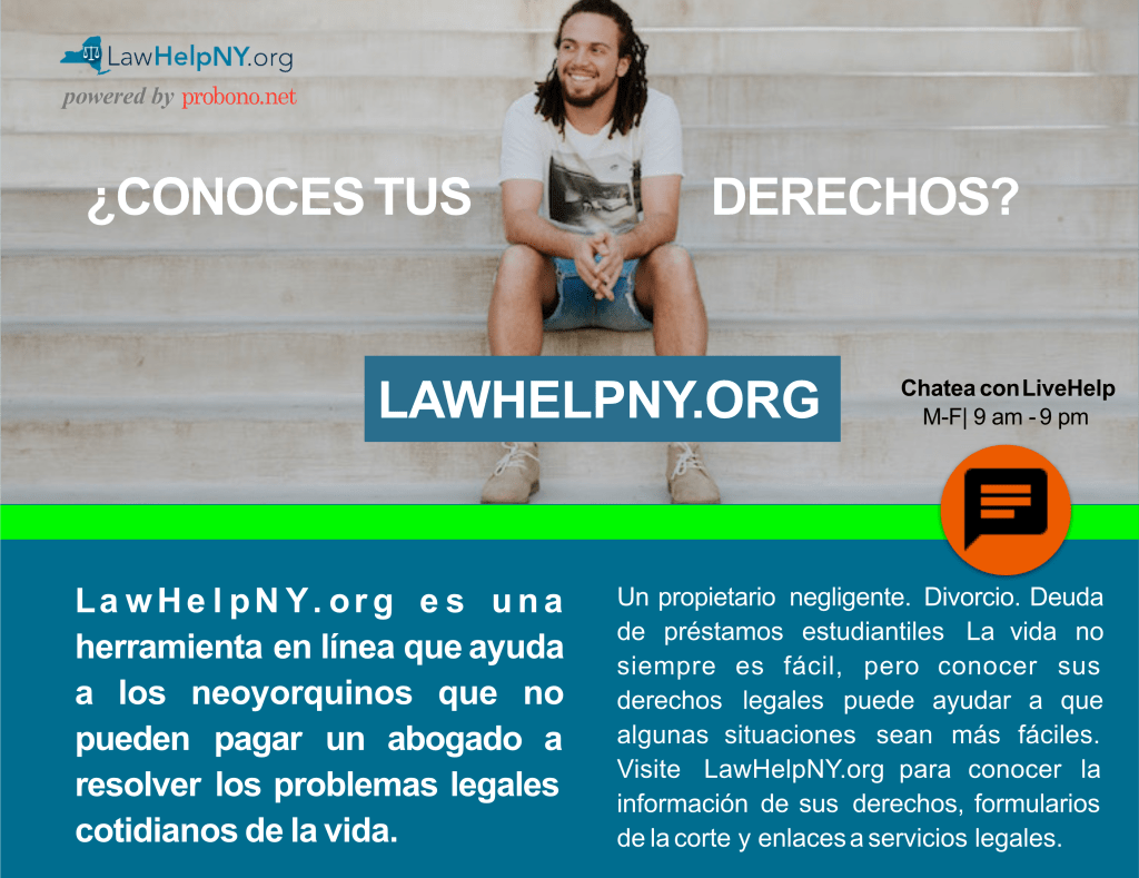 The postcard was distributed in libraries, community centers, and legal aid offices across New York State. It is double sided: one side is in English, the other is in Spanish.